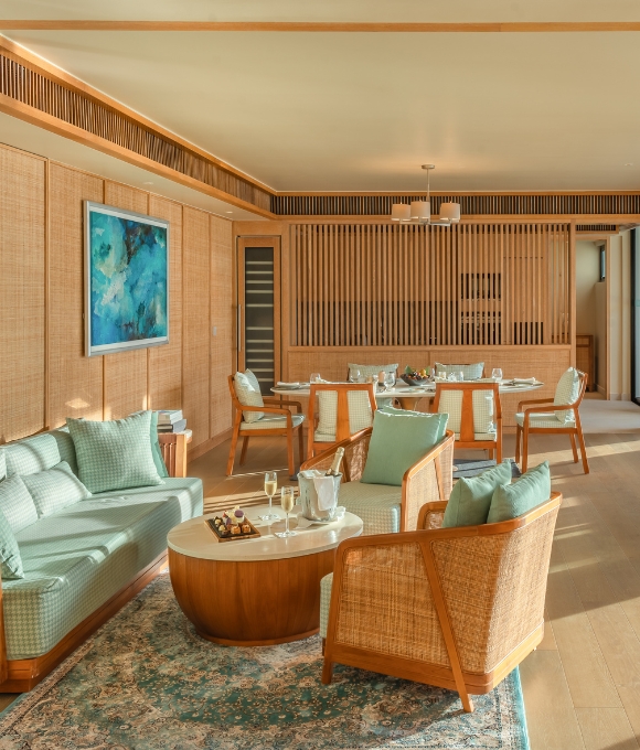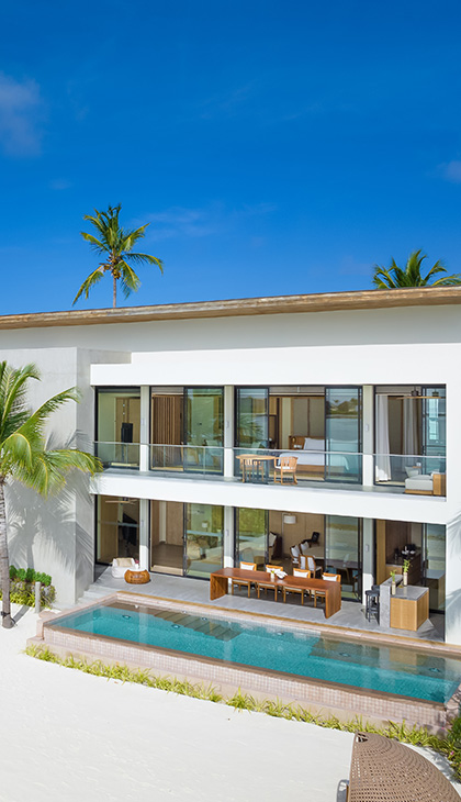 An expansive and luxurious three-bedroom beachfront residence featuring spacious living areas, a private pool overlooking the lagoon, panoramic ocean views, and exclusive amenities including a private terrace, dedicated workspace, wine cellar, and butler service.