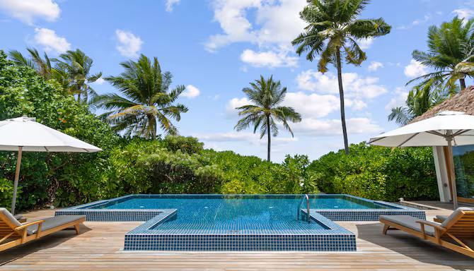 The Three Bedroom Beach Villa with Pool and Sunset View at Radisson Blu Resort Maldives offers a luxurious and spacious retreat ideal for families or groups. Features include two king beds and two twin beds, a private pool, separate living room, dining area, espresso machine, minibar, complimentary bottled water, bathtub, rain shower, and direct beach access with stunning sunset views.