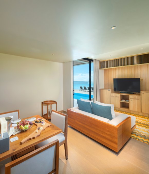 An expansive and luxurious three-bedroom beachfront residence featuring spacious living areas, a private pool overlooking the lagoon, panoramic ocean views, and exclusive amenities including a private terrace, dedicated workspace, wine cellar, and butler service.