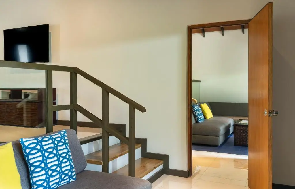 A spacious and comfortable two-bedroom villa surrounded by tropical gardens, featuring modern amenities, indoor-outdoor living spaces, a double vanity bathroom with bathtub and separate shower, and ideal for group getaways or family stays.