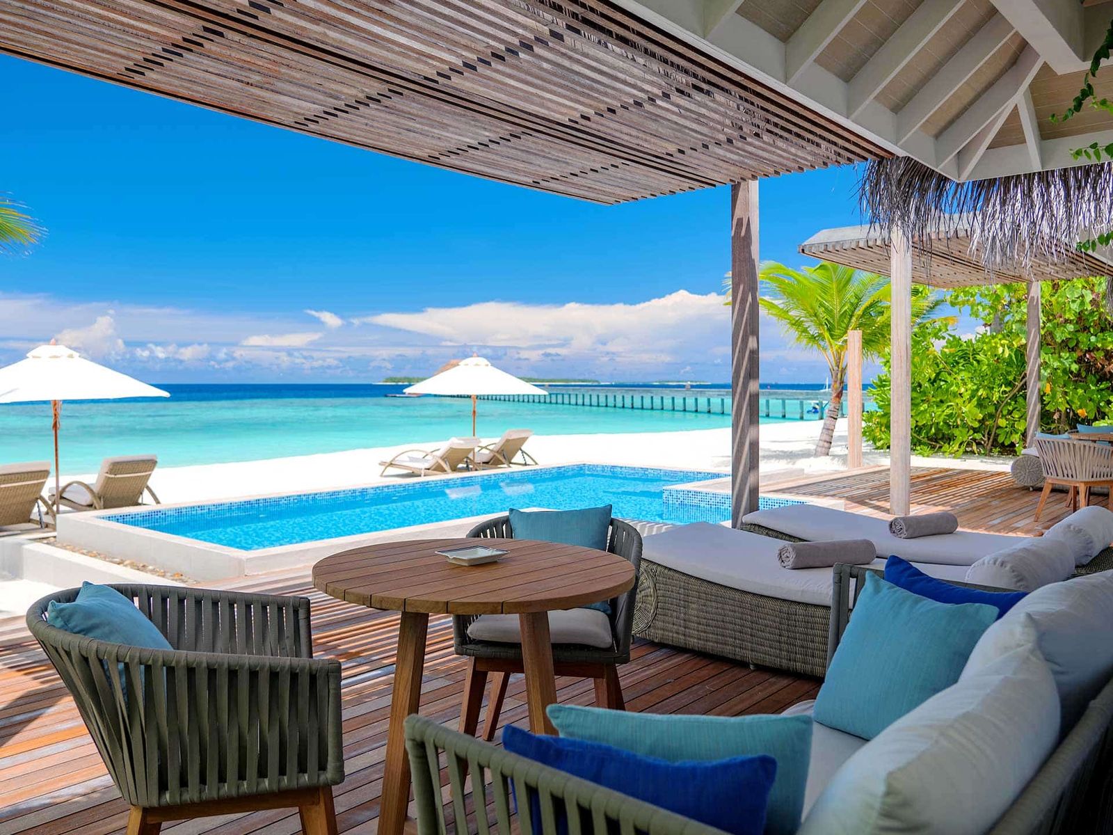 The Deluxe Beach Villa with Pool offers a luxurious beachfront experience with direct access to pristine white sands and stunning ocean views. It features a king-size bed, one bedroom, and a private pool for an exclusive stay.