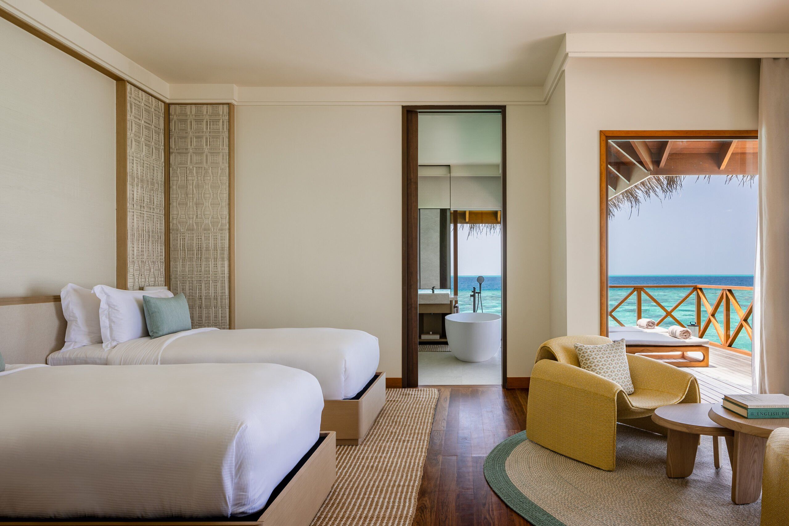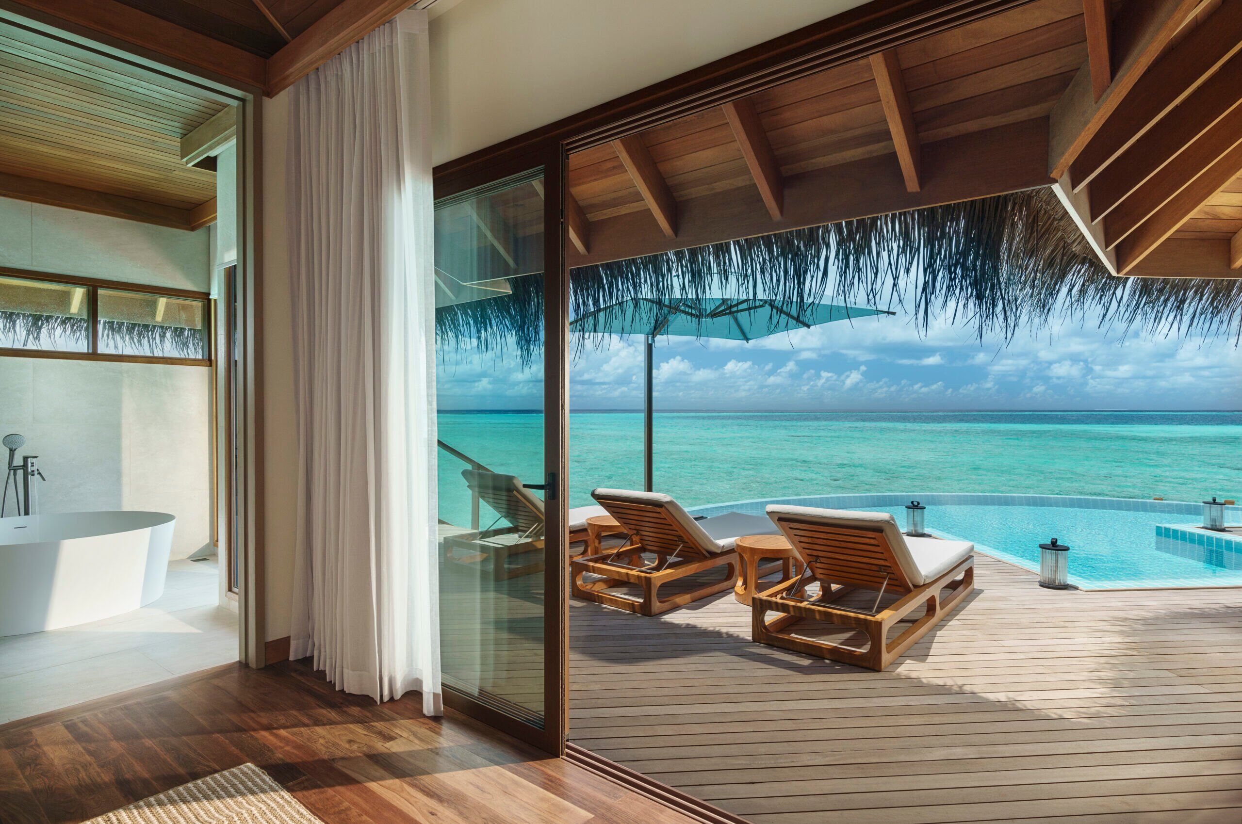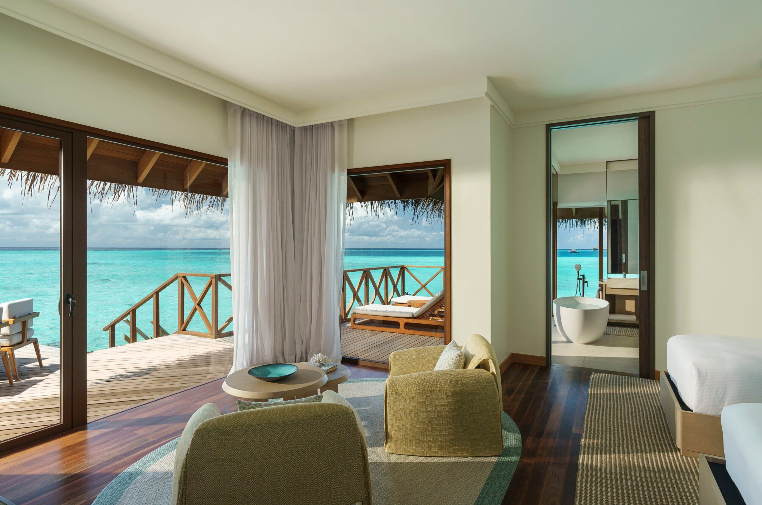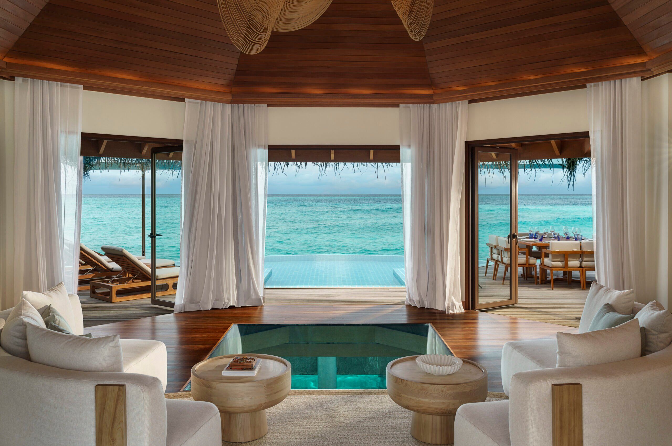 An expansive overwater sanctuary designed for families and friends seeking luxury and comfort, featuring two bedrooms each with its own bathroom, a private outdoor freshwater swimming pool, living room, dining room, kitchen, private deck with loungers, and direct lagoon access with sunrise lagoon views.
