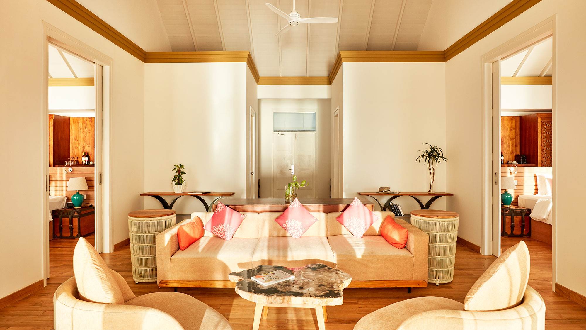 An expansive and luxurious beachfront retreat featuring two master bedrooms with king-size beds, a flexible living area, and the largest private pool on the island. Enjoy spectacular sunrise views over the beach and ample outdoor space with daybeds, loungers, and a dining area.