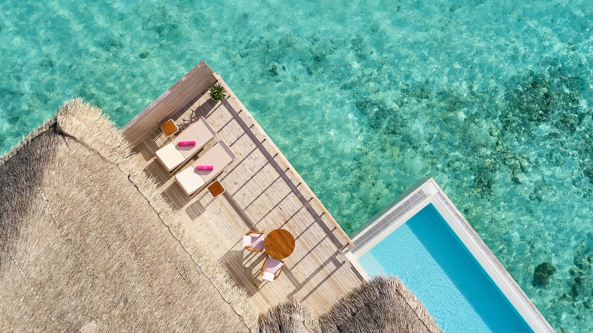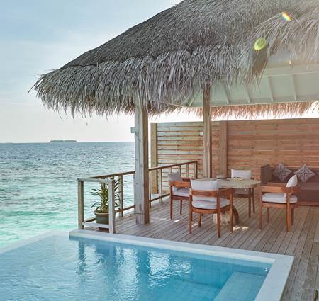 Luxurious overwater residence featuring an expansive sundeck and veranda, private infinity pool, and uninterrupted lagoon and Indian Ocean views. Perfect for couples and families seeking spacious and elegant accommodation with separate lounging and dining areas.