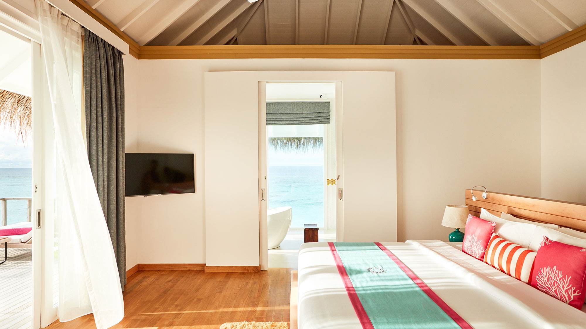 A contemporary overwater villa flooded with natural light, featuring a king-size bedroom, spacious bathroom with a freestanding tub and separate walk-in rain shower, and a fully furnished outdoor deck with a private plunge pool and direct lagoon access.