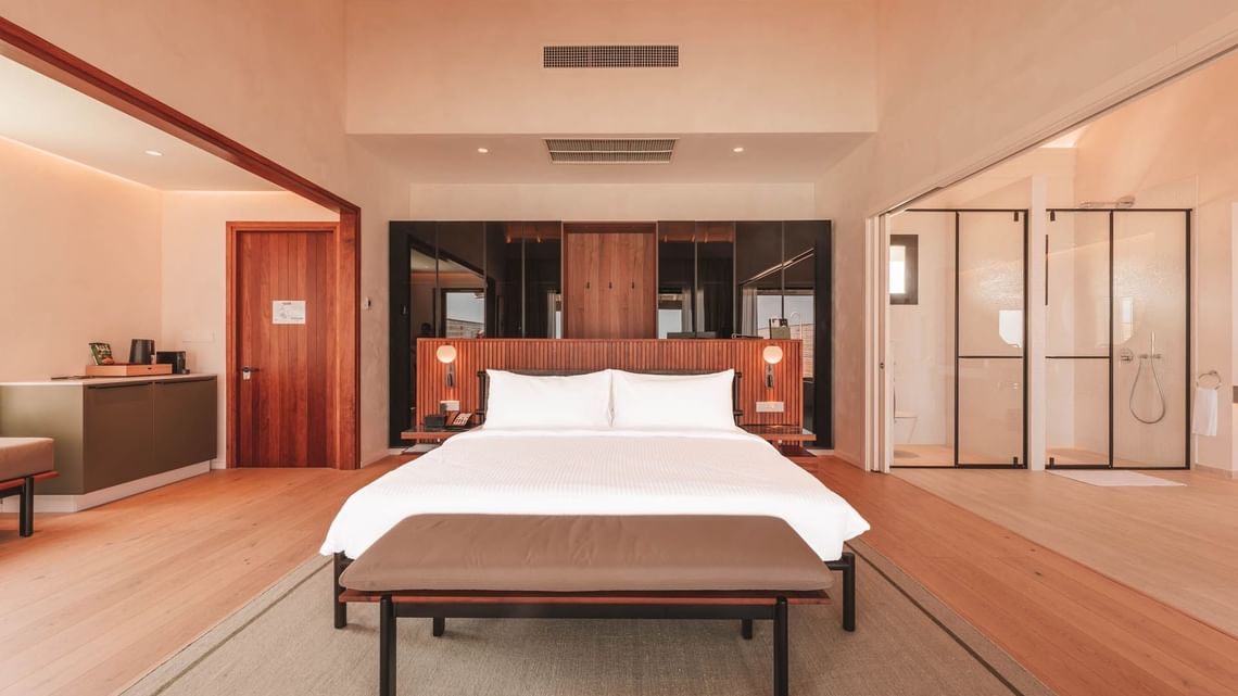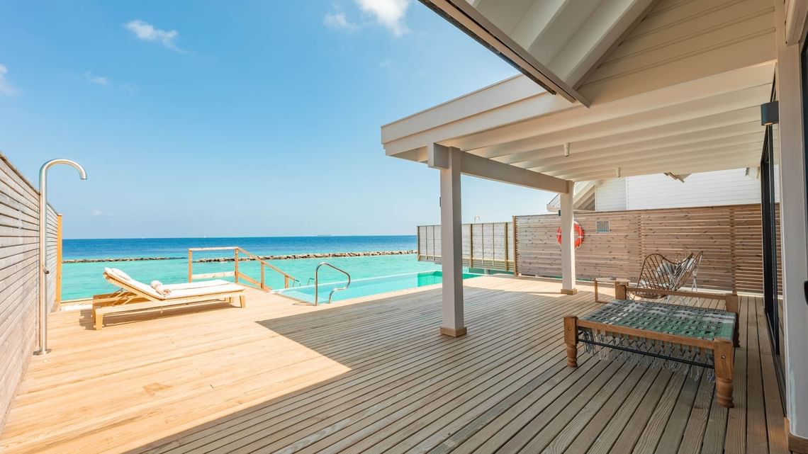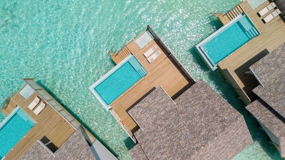 An overwater villa perched above the lagoon, featuring a private pool, open-air bathroom with a bathtub, rain shower, and outdoor shower. Equipped with air conditioning, minibar, safe, TV, Wi-Fi, kettle, and coffee/tea facilities. Size: 180 sqm. Suitable for 3 adults or 2 adults and 1 child.